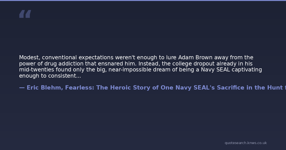 Modest, conventional expectations weren't enough to lure Adam Brown away from the power of drug addiction that ensnared him. Instead, the college dropout already in his mid-twenties found only the big, near-impossible dream of being a Navy SEAL captivating enough to consistently draw him to different choices.
