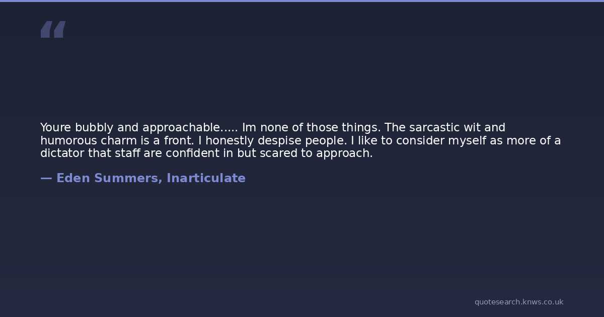 Youre bubbly and approachable..... Im none of those things. The sarcastic wit and humorous charm is a front. I honestly despise people. I like to consider myself as more of a dictator that staff are confident in but scared to approach.