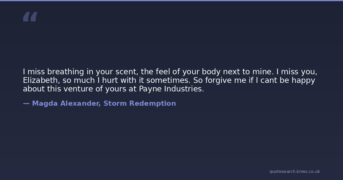 I miss breathing in your scent, the feel of your body next to mine. I miss you, Elizabeth, so much I hurt with it sometimes. So forgive me if I cant be happy about this venture of yours at Payne Industries.