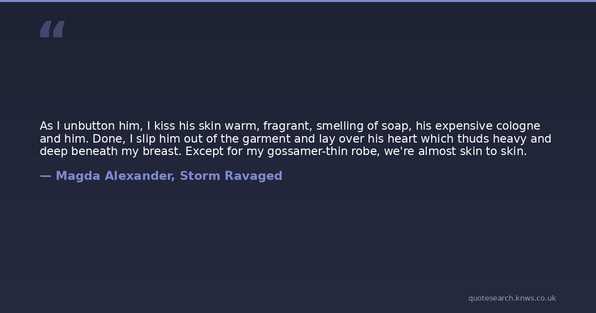 As I unbutton him, I kiss his skin warm, fragrant, smelling of soap, his expensive cologne and him. Done, I slip him out of the garment and lay over his heart which thuds heavy and deep beneath my breast. Except for my gossamer-thin robe, we're almost skin to skin.