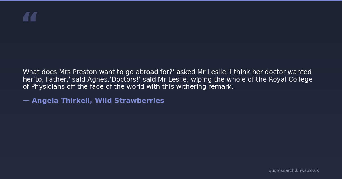 What does Mrs Preston want to go abroad for?' asked Mr Leslie.'I think her doctor wanted her to, Father,' said Agnes.'Doctors!' said Mr Leslie, wiping the whole of the Royal College of Physicians off the face of the world with this withering remark.