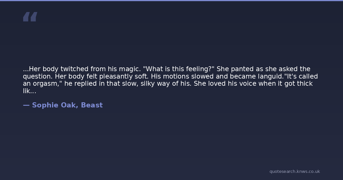 ...Her body twitched from his magic. "What is this feeling?" She panted as she asked the question. Her body felt pleasantly soft. His motions slowed and became languid."It's called an orgasm," he replied in that slow, silky way of his. She loved his voice when it got thick like honey. Most of the time he spoke so quickly that she lost track. She liked it when his tone got deep and husky. "You should have one every time a man touches you. If you don't, punch him in the face.