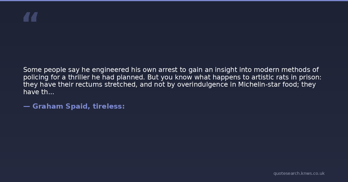 Some people say he engineered his own arrest to gain an insight into modern methods of policing for a thriller he had planned. But you know what happens to artistic rats in prison: they have their rectums stretched, and not by overindulgence in Michelin-star food; they have their columns examined, and not by internet humorists or a qualified medical practitioner. Im sure Rat knew this, too. Although he likes to accumulate a wide general knowledge, he would rather have a narrow rectum. A colon comes in handy here, before examples: two dots on top of one other, like the cowboys who copulate on Brokeback Mountain, on a slope so far away you need binoculars to see them properly. In prison there are too many insights and examples. Rat would never risk it.