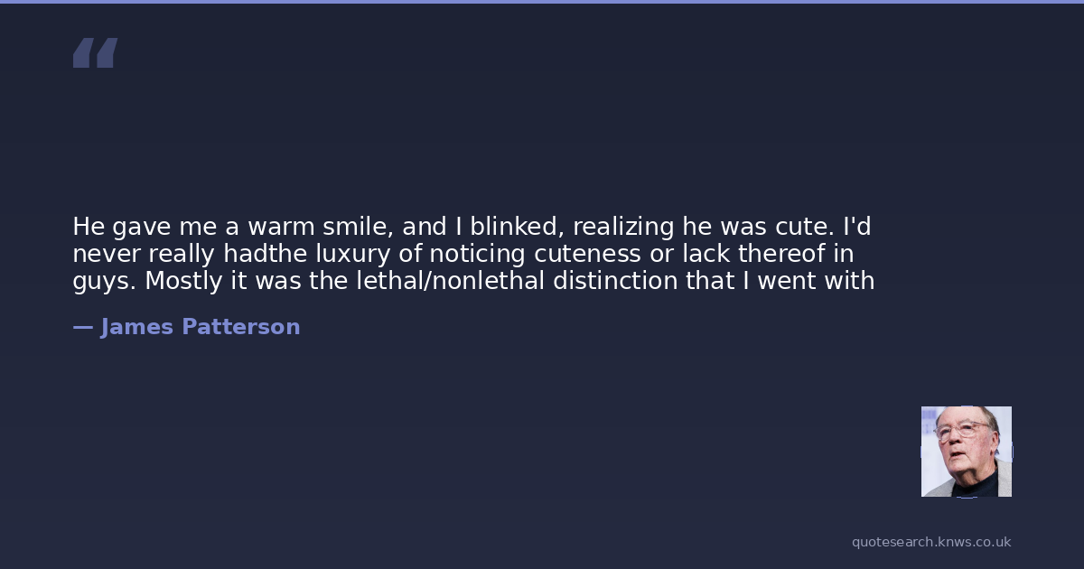 He gave me a warm smile, and I blinked, realizing he was cute. I'd never really hadthe luxury of noticing cuteness or lack thereof in guys. Mostly it was the lethal/nonlethal distinction that I went with