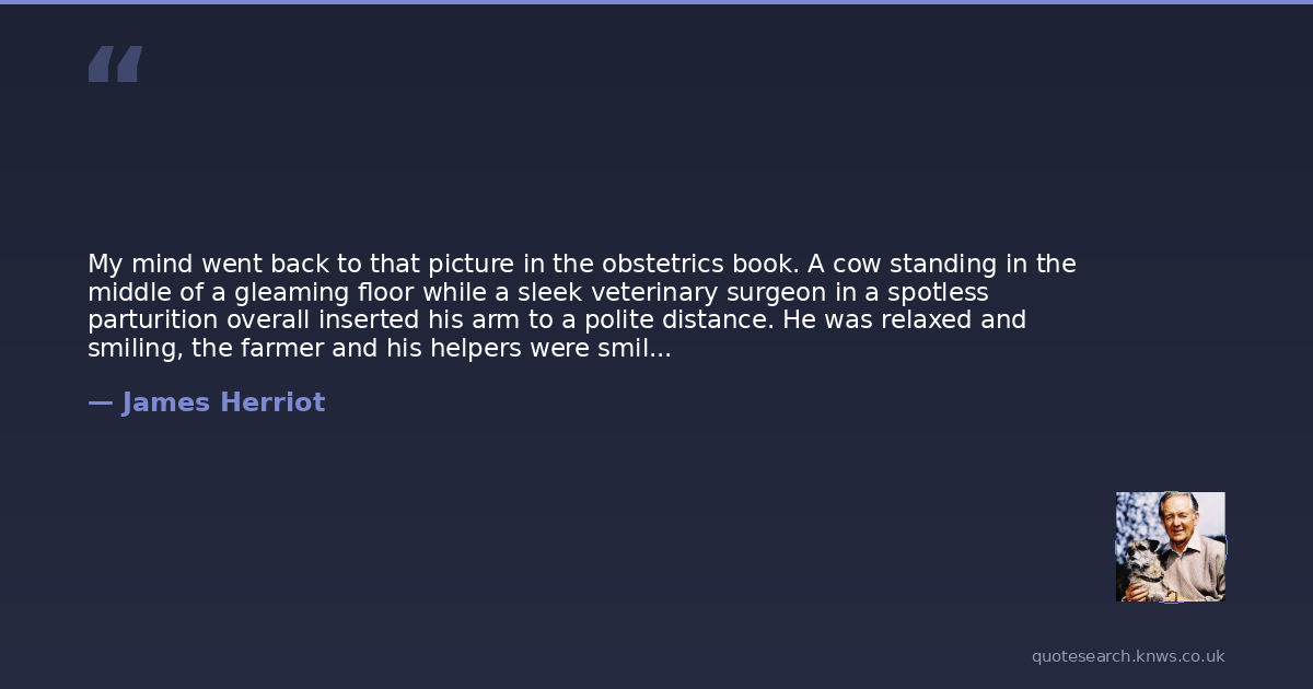 My mind went back to that picture in the obstetrics book. A cow standing in the middle of a gleaming floor while a sleek veterinary surgeon in a spotless parturition overall inserted his arm to a polite distance. He was relaxed and smiling, the farmer and his helpers were smiling, even the cow was smiling. There was no dirt or blood or sweat anywhere.That man in the picture had just finished an excellent lunch and had moved next door to do a bit of calving just for the sheer pleasure of it, as a kind of dessert. He hadn't crawled shivering from his bed at two o'clock in the morning and bumped over twelve miles of frozen snow, staring sleepily ahead till the lonely farm showed in the headlights. He hadn't climbed half a mile of white fell-side to the doorless barn where his patient lay.