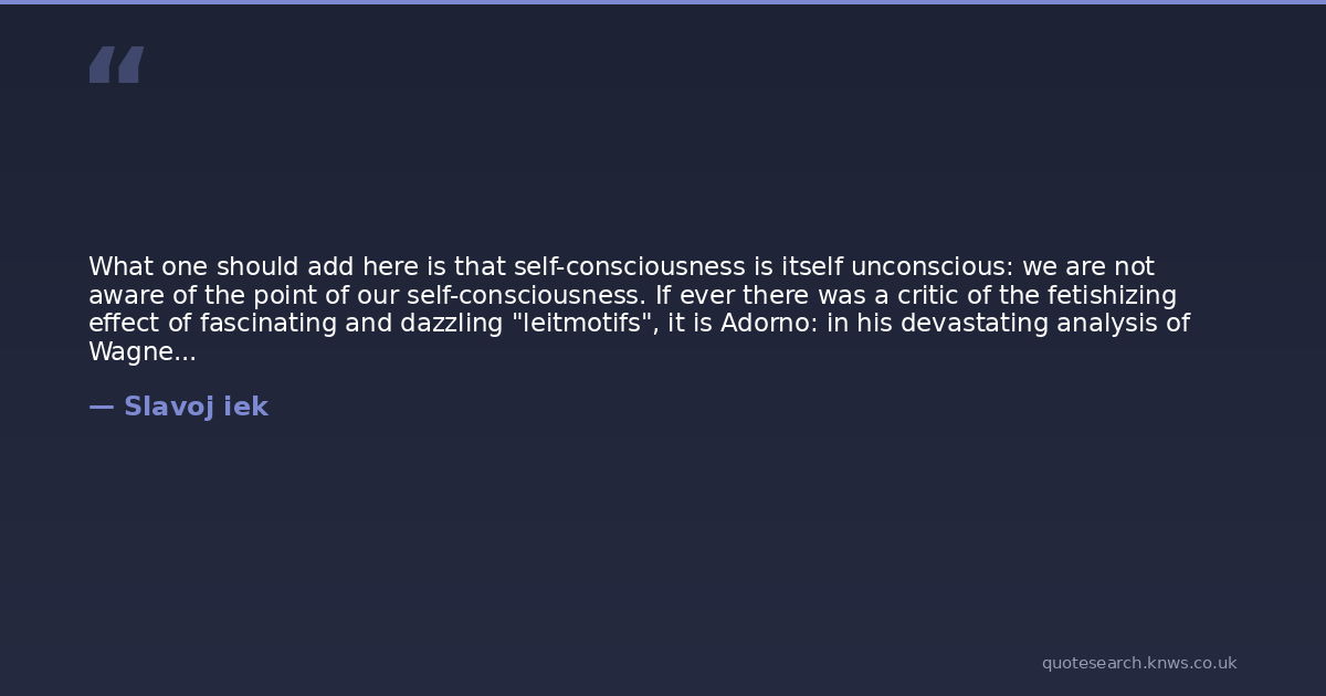 What one should add here is that self-consciousness is itself unconscious: we are not aware of the point of our self-consciousness. If ever there was a critic of the fetishizing effect of fascinating and dazzling "leitmotifs", it is Adorno: in his devastating analysis of Wagner, he tries to demonstrate how Wagnerian leitmotifs serve as fetishized elements of easy recognition and thus constitute a kind of inner-structural commodification of his music. It is then a supreme irony that traces of this same fetishizing procedure can be found in Adorno's own writings. Many of his provocative one-liners do effectively capture a profound insight or at least touch on a crucial point (for example: "Nothing is more true in pscyhoanalysis than its exaggeration"); however, more often than his partisans are ready to admit, Adorno gets caught up in his own game, infatuated with his own ability to produce dazzlingly "effective" paradoxical aphorisms at the expense of theoretical substance (recall the famous line from Dialectic of Englightment on how Hollywood's ideological maniuplation of social reality realized Kant's idea of the transcendental constitution of reality). In such cases where the dazzling "effect" of the unexpected short-circuit (here between Hollywood cinema and Kantian ontology) effectively overshadows the theoretical line of argumentation, the brilliant paradox works precisely in the same manner as the Wagnerian leitmotif: instead of serving as a nodal point in the complex network of structural mediation, it generates idiotic pleasure by focusing attention on itself. This unintended self-reflexivity is something of which Adorno undoubtedly was not aware: his critique of the Wagnerian leitmotif was an allegorical critique of his own writing. Is this not an exemplary case of his unconscious reflexivity of thinking? When criticizing his opponent Wagner, Adorno effectively deploys a critical allegory of his own writing - in Hegelese, the truth of his relation to the Other is a self-relation.