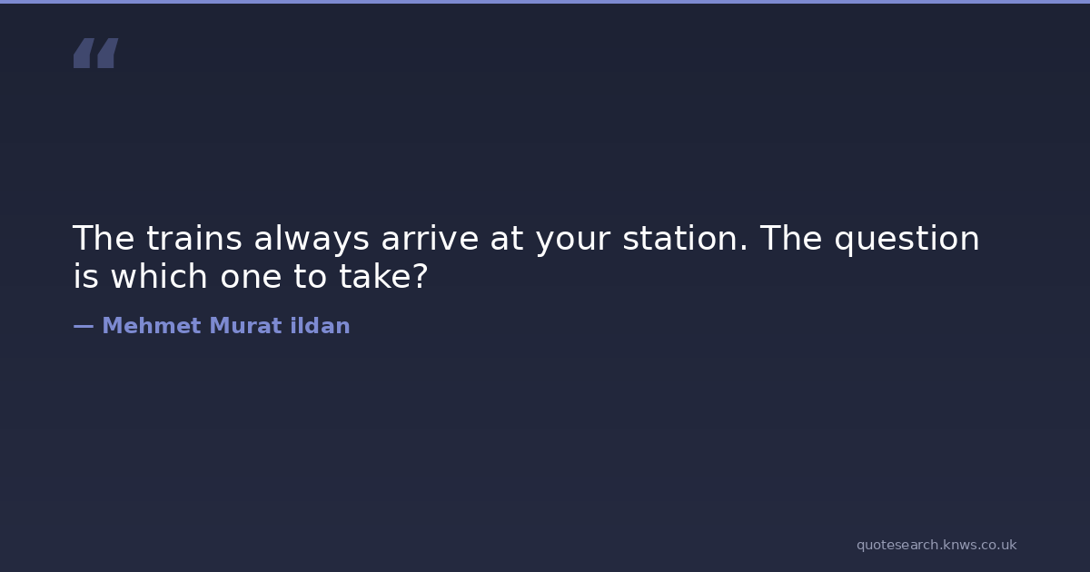 The trains always arrive at your station. The question is which one to take? arriving get-on-the-train ildan-wisdom ildan-wise-sayings ildan-words mehmet-murat-ildan-quotations mehmet-murat-ildan-quotes station stations the-question train trains turkish-authors turkish-literature turkish-playwrights turkish-quotations turkish-quotes turkish-wisdom-words turkish-writers Download Image Share on X Share on Facebook Copy Link