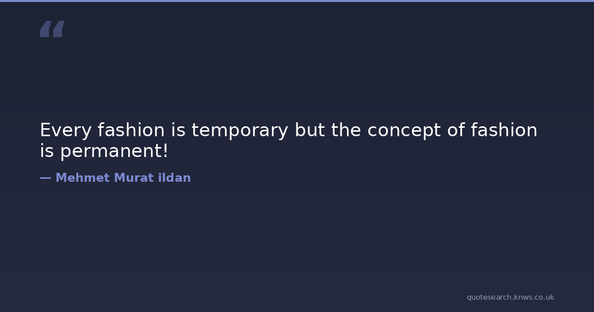 Every fashion is temporary but the concept of fashion is permanent! fashion fashion-quotations fashion-quotes ildan-wisdom ildan-wise-sayings ildan-words mehmet-murat-ildan-quotations mehmet-murat-ildan-quotes permanent temporary turkish-authors turkish-literature turkish-playwrights turkish-quotations turkish-quotes turkish-wisdom-words turkish-writers Download Image Share on X Share on Facebook Copy Link
