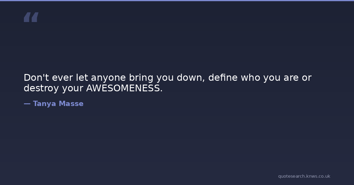 Don't ever let anyone bring you down, define who you are or destroy your AWESOMENESS. anti-bullying awesome awesome-quotes awesomeness inspirational-quotes life-changing life-lessons Download Image Share on X Share on Facebook Copy Link