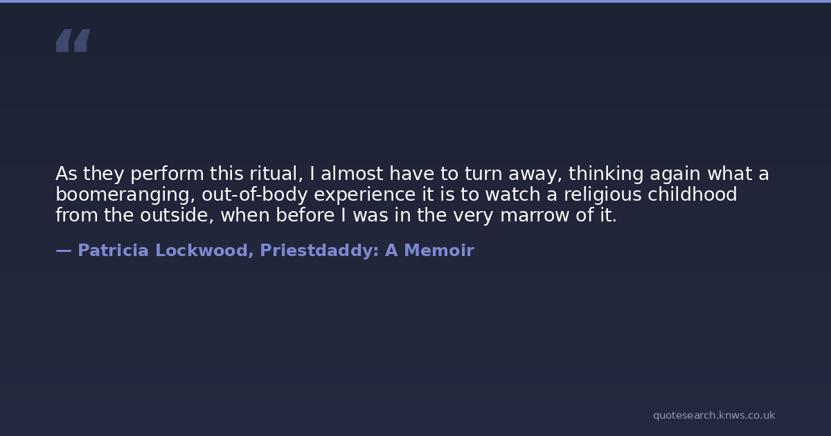 As they perform this ritual, I almost have to turn away, thinking again what a boomeranging, out-of-body experience it is to watch a religious childhood from the outside, when before I was in the very marrow of it.