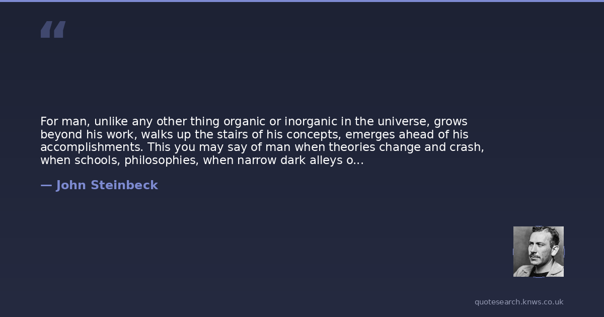 For man, unlike any other thing organic or inorganic in the universe, grows beyond his work, walks up the stairs of his concepts, emerges ahead of his accomplishments. This you may say of man when theories change and crash, when schools, philosophies, when narrow dark alleys of thought, national, religious, economic, grow and disintegrate, man reaches, stumbles forward, painfully, mistakenly sometimes. Having stepped forward, he may slip back, but only half a step, never the full step back. This you may say and know it and know it. This you may know when the bombs plummet out of the black planes on the market place, when prisoners are stuck like pigs, when the crushed bodies drain filthily in the dust. You may know it in this way. If the step were not being taken, if the stumbling-forward ache were not alive, the bombs would not fall, the throats would not be cut. Fear the time when the bombs stop falling while the bombers live- for every bomb is proof that the spirit has not died. And fear the time when the strikes stop while the great owners live- for every little beaten strike is proof that the step is being taken. And this you can know- fear the time when Manself will not suffer and die for a concept, for this one quality is the foundation of Manself, and this one quality is man, distinctive in the universe.