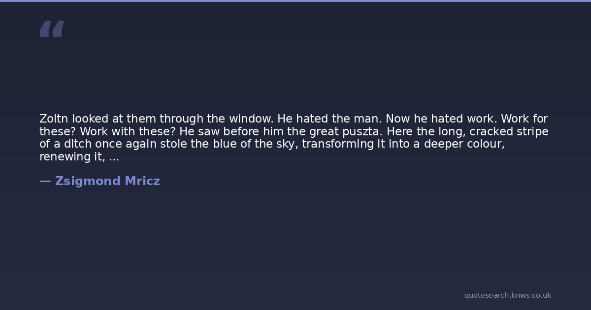 Zoltn looked at them through the window. He hated the man. Now he hated work. Work for these? Work with these? He saw before him the great puszta. Here the long, cracked stripe of a ditch once again stole the blue of the sky, transforming it into a deeper colour, renewing it, like an artist's palette: every pool on the meadows, every clump of flowers, was a jewel on the bosom of nature, a diadem, a string of pearls: oh, nature was lovely... That is, it would be if it could... But mankind... Among these? Struggle, fight, this greedy little piece of meat... Dark furrows on the wondrous surface, the many-branched, tufted promise of the maize, jewelled patches on God's regal robe: why was the world so lovely? to cover up the ugliness of man?