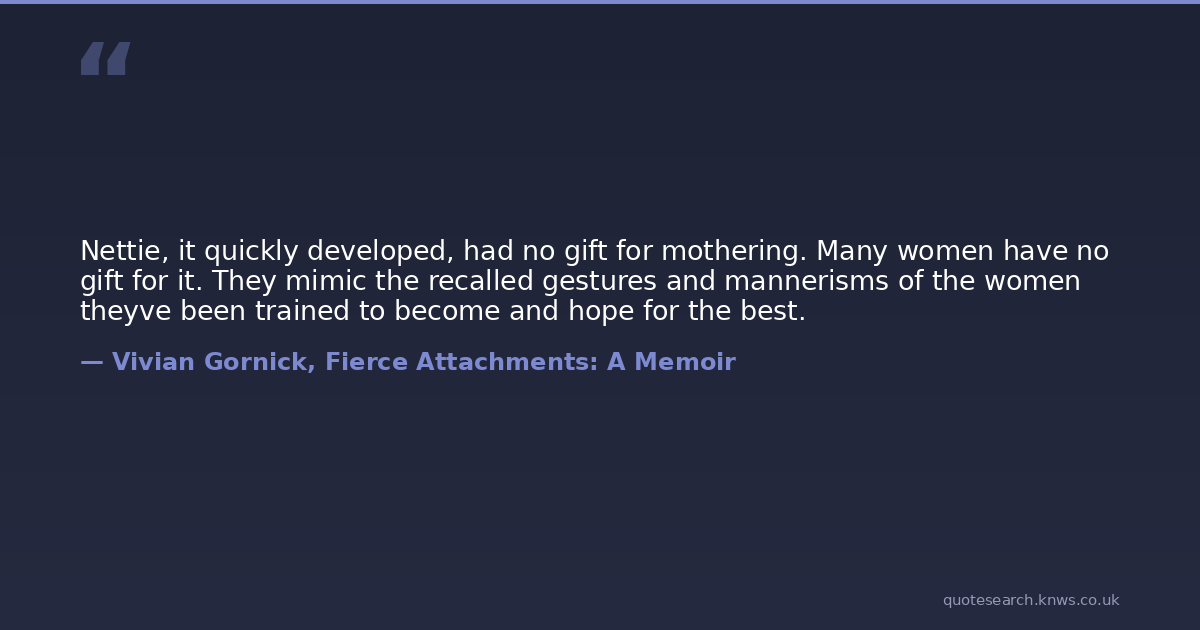 Nettie, it quickly developed, had no gift for mothering. Many women have no gift for it. They mimic the recalled gestures and mannerisms of the women theyve been trained to become and hope for the best.