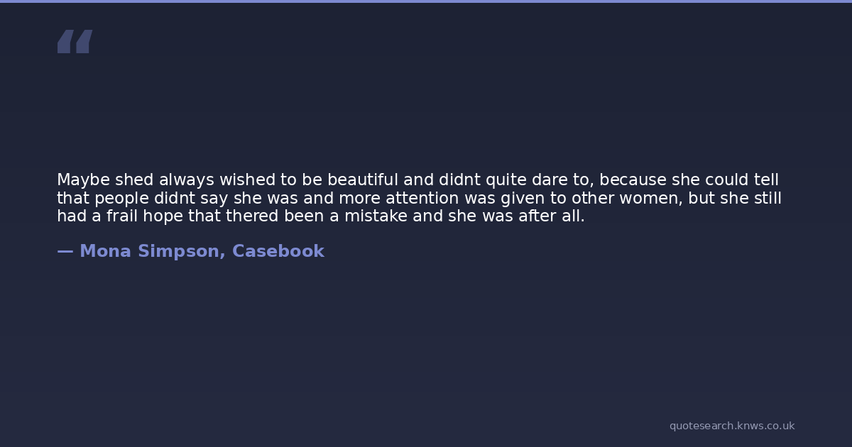 Maybe shed always wished to be beautiful and didnt quite dare to, because she could tell that people didnt say she was and more attention was given to other women, but she still had a frail hope that thered been a mistake and she was after all.