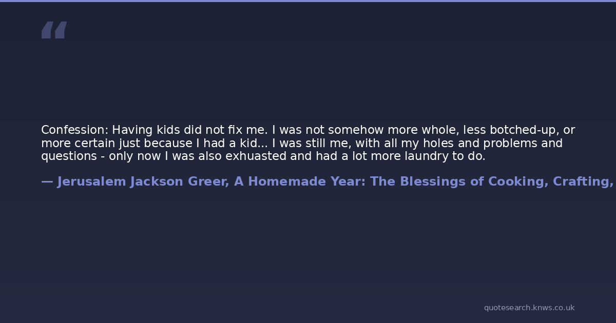 Confession: Having kids did not fix me. I was not somehow more whole, less botched-up, or more certain just because I had a kid... I was still me, with all my holes and problems and questions - only now I was also exhuasted and had a lot more laundry to do.