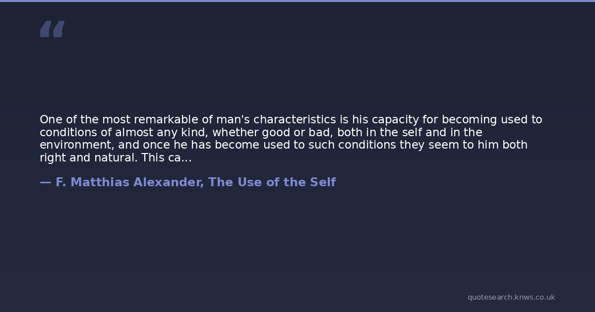 One of the most remarkable of man's characteristics is his capacity for becoming used to conditions of almost any kind, whether good or bad, both in the self and in the environment, and once he has become used to such conditions they seem to him both right and natural. This capacity is a boon when it enables him to adapt himself to conditions which are desirable, but it may prove a great danger when the conditions are undesirable. When his sensory appreciation is untrustworthy, it is possible for him to become so familiar with seriously harmful conditions of misuse of himself that these malconditions will feel right and comfortable.