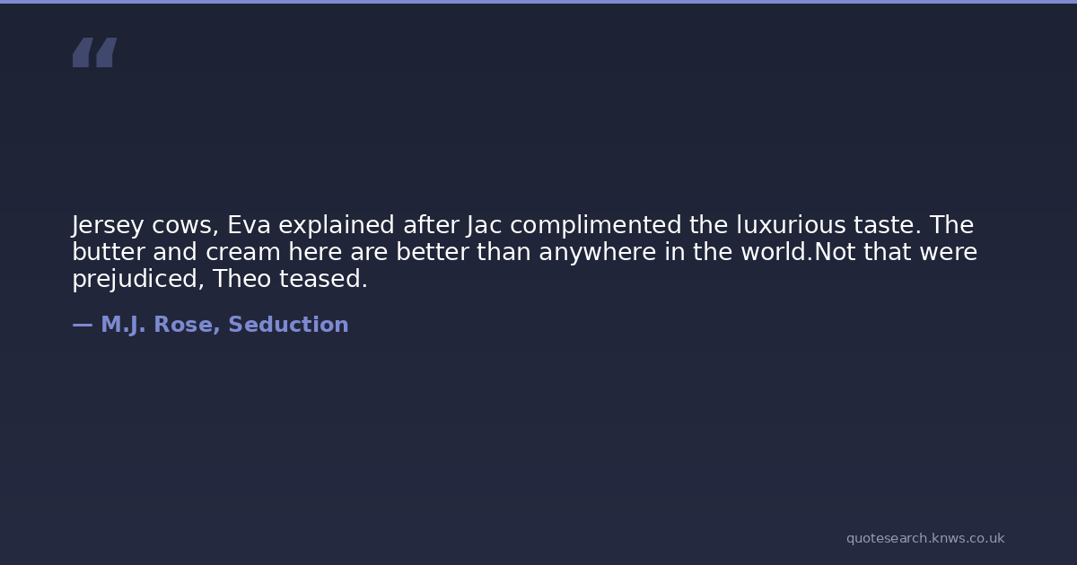 Jersey cows, Eva explained after Jac complimented the luxurious taste. The butter and cream here are better than anywhere in the world.Not that were prejudiced, Theo teased.