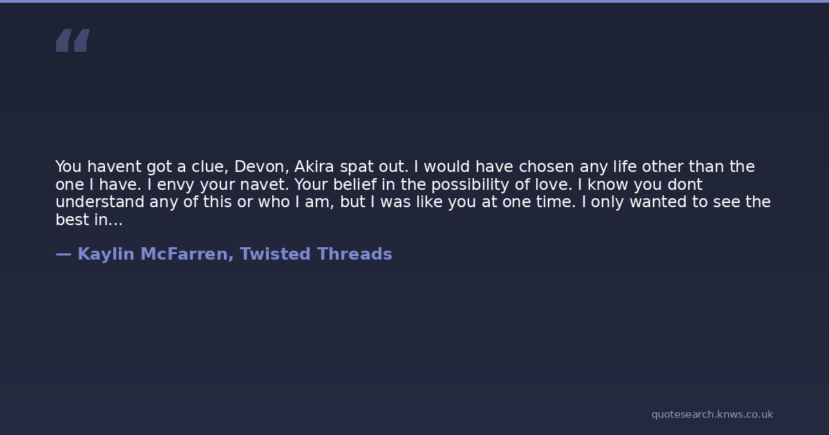 You havent got a clue, Devon, Akira spat out. I would have chosen any life other than the one I have. I envy your navet. Your belief in the possibility of love. I know you dont understand any of this or who I am, but I was like you at one time. I only wanted to see the best in people. To believe this world was filled with hope and kindness. Her bitterness was apparent. I thought compassion came with understandingwith seeing inside a persons heart and knowing their true mind. But I was wrong. Nothing in this world is what it seems.