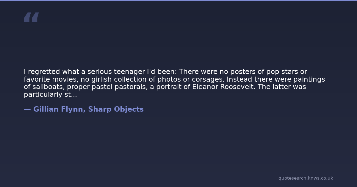 I regretted what a serious teenager I'd been: There were no posters of pop stars or favorite movies, no girlish collection of photos or corsages. Instead there were paintings of sailboats, proper pastel pastorals, a portrait of Eleanor Roosevelt. The latter was particularly strange, since I'd known little about Mrs. Roosevelt, except that she was good, which at the time I suppose was enough. Given my druthers now, I'd prefer a snapshot of Warren Harding's wife, "the Duchess," who recorded the smallest offenses in a little red notebook and avenged herself accordingly. Today I like my first ladies with a little bite.