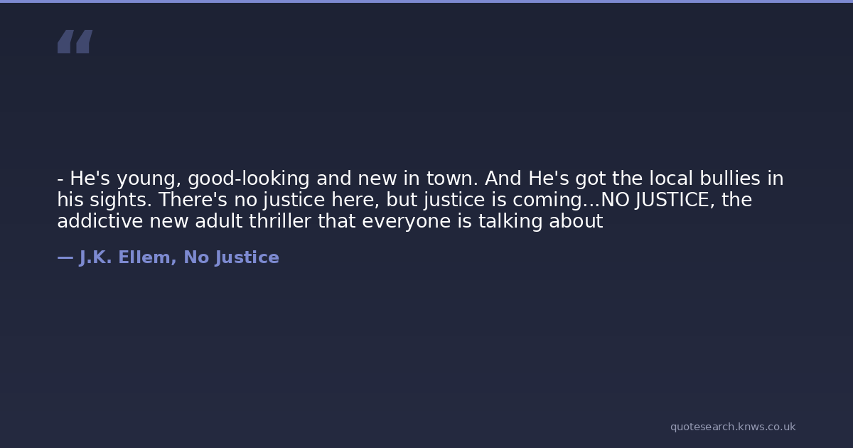 - He's young, good-looking and new in town. And He's got the local bullies in his sights. There's no justice here, but justice is coming...NO JUSTICE, the addictive new adult thriller that everyone is talking about