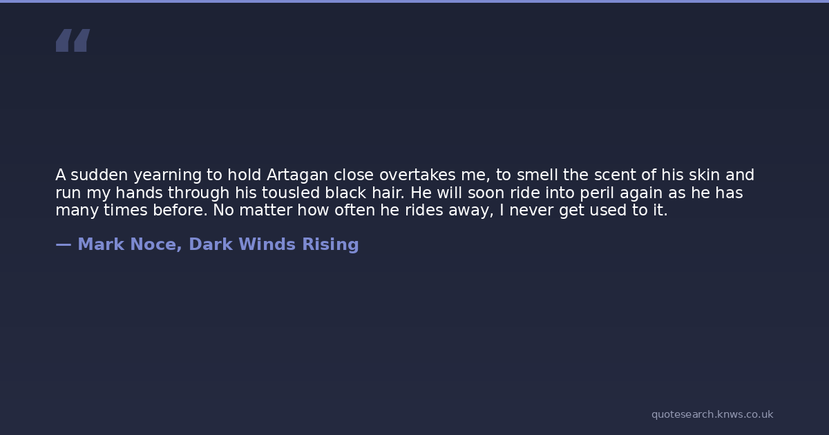 A sudden yearning to hold Artagan close overtakes me, to smell the scent of his skin and run my hands through his tousled black hair. He will soon ride into peril again as he has many times before. No matter how often he rides away, I never get used to it.