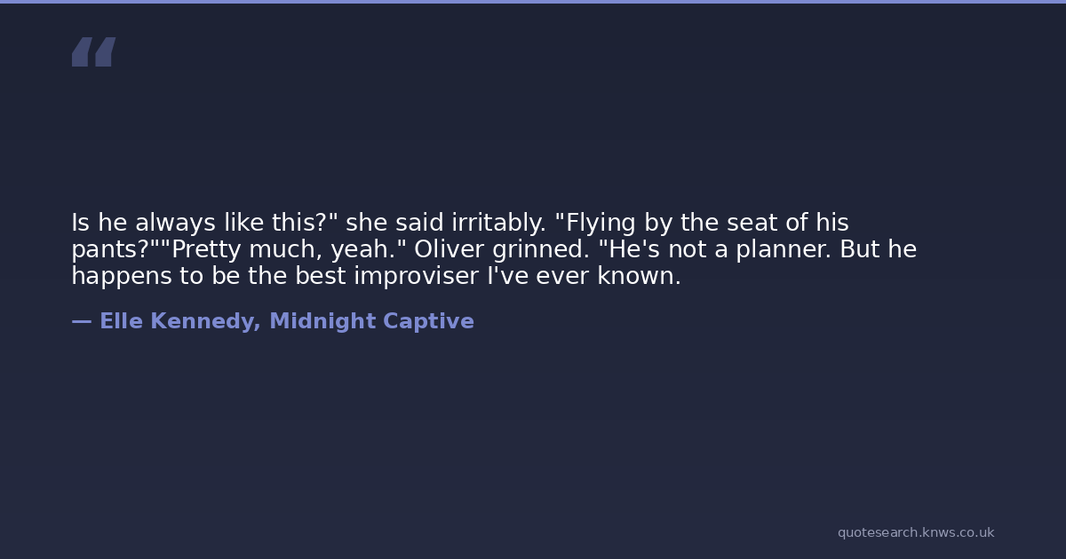 Is he always like this?" she said irritably. "Flying by the seat of his pants?""Pretty much, yeah." Oliver grinned. "He's not a planner. But he happens to be the best improviser I've ever known.