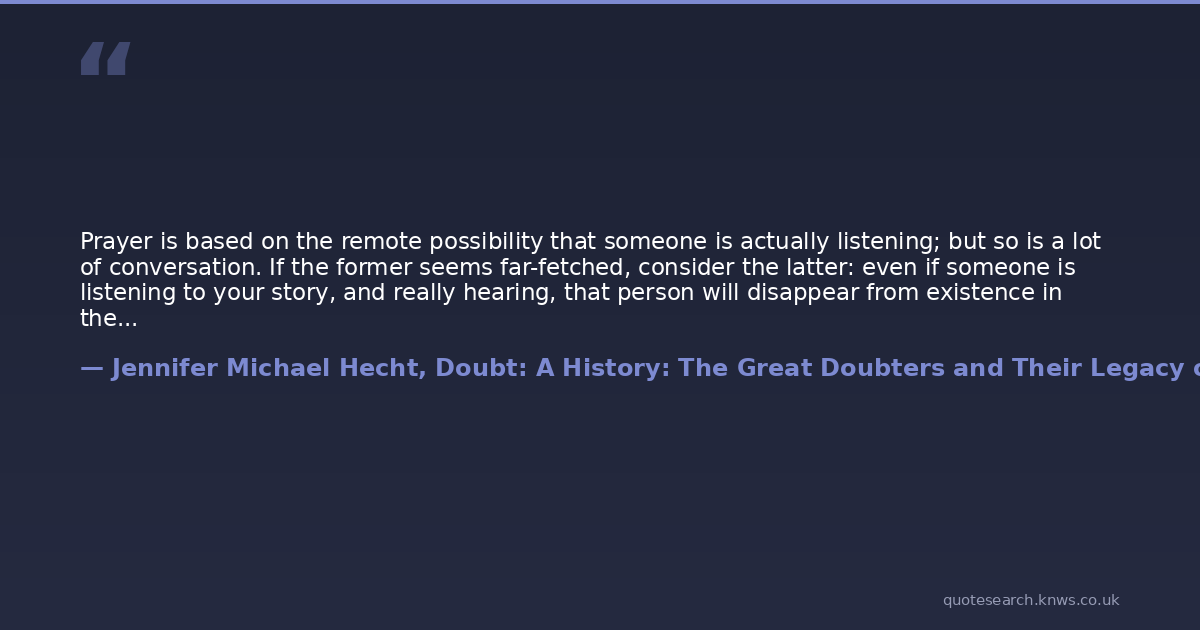 Prayer is based on the remote possibility that someone is actually listening; but so is a lot of conversation. If the former seems far-fetched, consider the latter: even if someone is listening to your story, and really hearing, that person will disappear from existence in the blink of a cosmic eye, so why bother to tell this perhaps illusory and possibly un-listening person something he or she is unlikely to truly understand, just before the two of you blip back out of existence? We like to talk to people who answer us, intelligently if possible, but we do talk without needing response or expecting comprehension. Sometimes, the event is the word, the act of speaking. Once we pull that apart a bit, the action of talking becomes more important than the question of whether the talking is working-because we know, going in, that the talking is not working. That said, one might as well pray.