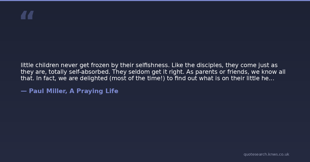 little children never get frozen by their selfishness. Like the disciples, they come just as they are, totally self-absorbed. They seldom get it right. As parents or friends, we know all that. In fact, we are delighted (most of the time!) to find out what is on their little hearts. We dont scold them for being self-absorbed or fearful. That is just who they are.