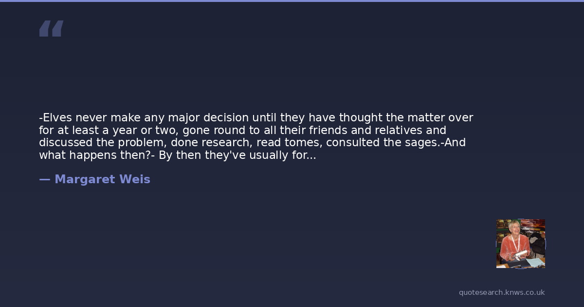 -Elves never make any major decision until they have thought the matter over for at least a year or two, gone round to all their friends and relatives and discussed the problem, done research, read tomes, consulted the sages.-And what happens then?- By then they've usually forgotten what it was they meant to do in the first place.