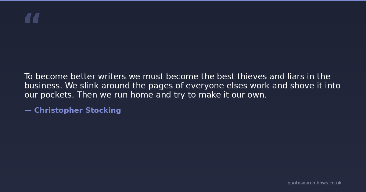 To become better writers we must become the best thieves and liars in the business. We slink around the pages of everyone elses work and shove it into our pockets. Then we run home and try to make it our own.