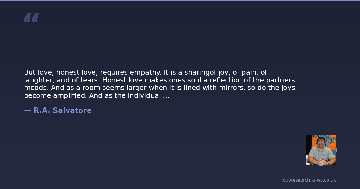 But love, honest love, requires empathy. It is a sharingof joy, of pain, of laughter, and of tears. Honest love makes ones soul a reflection of the partners moods. And as a room seems larger when it is lined with mirrors, so do the joys become amplified. And as the individual items within the mirrored room seem less acute, so does pain diminish and fade, stretched thin by the sharing. That is the beauty of love, whether in passion or friendship. A sharing that multiplies the joys and thins the pains.