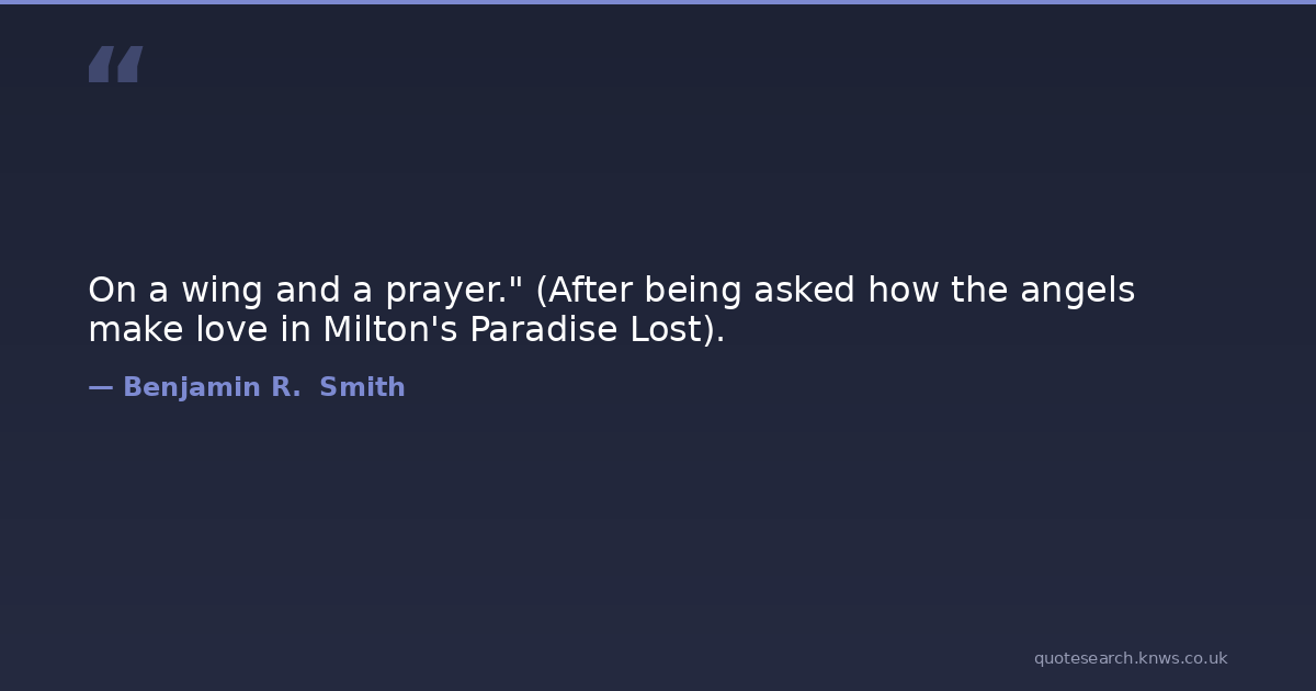 On a wing and a prayer." (After being asked how the angels make love in Milton's Paradise Lost).