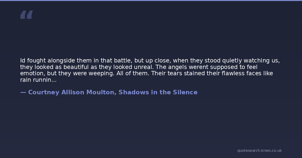 Id fought alongside them in that battle, but up close, when they stood quietly watching us, they looked as beautiful as they looked unreal. The angels werent supposed to feel emotion, but they were weeping. All of them. Their tears stained their flawless faces like rain running in rivulets across stone.