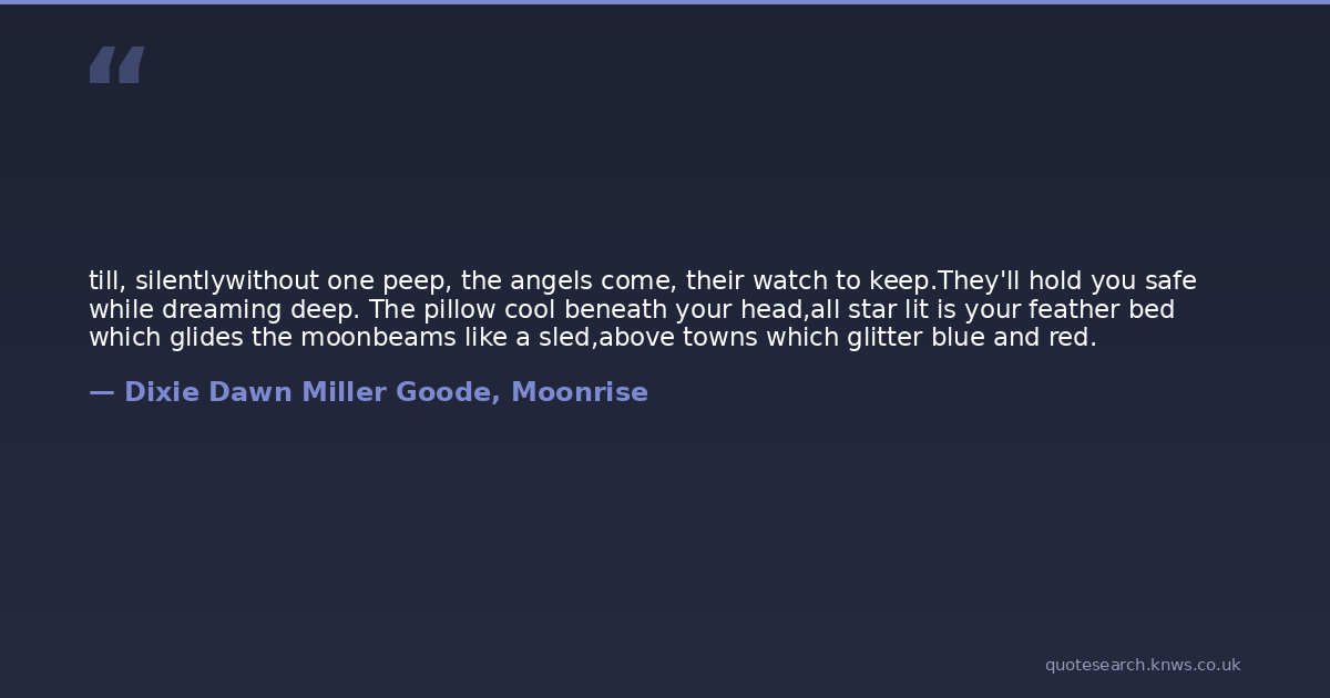 till, silentlywithout one peep, the angels come, their watch to keep.They'll hold you safe while dreaming deep. The pillow cool beneath your head,all star lit is your feather bed which glides the moonbeams like a sled,above towns which glitter blue and red.