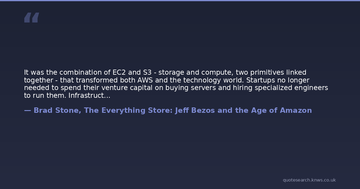 It was the combination of EC2 and S3 - storage and compute, two primitives linked together - that transformed both AWS and the technology world. Startups no longer needed to spend their venture capital on buying servers and hiring specialized engineers to run them. Infrastructure costs were variable instead of fixed, and they could grow in direct proportion to revenues. It freed companies to experiment, to change their business models with a minimum of pain, and to keep up with the rapidly growing audiences of erupting social networks like Facebook and Twitter.