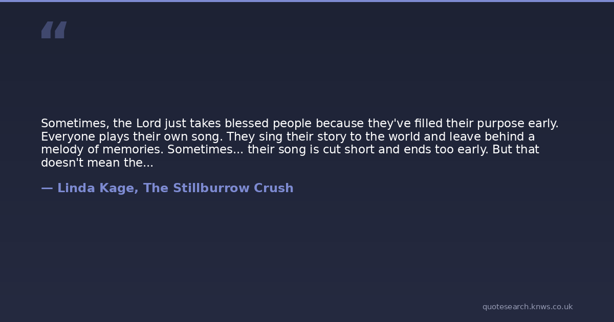 Sometimes, the Lord just takes blessed people because they've filled their purpose early. Everyone plays their own song. They sing their story to the world and leave behind a melody of memories. Sometimes... their song is cut short and ends too early. But that doesn't mean their music was any less sweet or that they left any less of an impression.