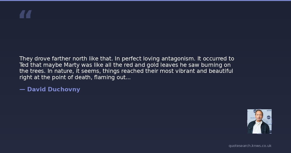 They drove farther north like that. In perfect loving antagonism. It occurred to Ted that maybe Marty was like all the red and gold leaves he saw burning on the trees. In nature, it seems, things reached their most vibrant and beautiful right at the point of death, flaming out with all they hadwhy not natural man? His father was red, green, yellow, and gold, like a beautiful bird falling from the sky. Parodoxical undressing again.