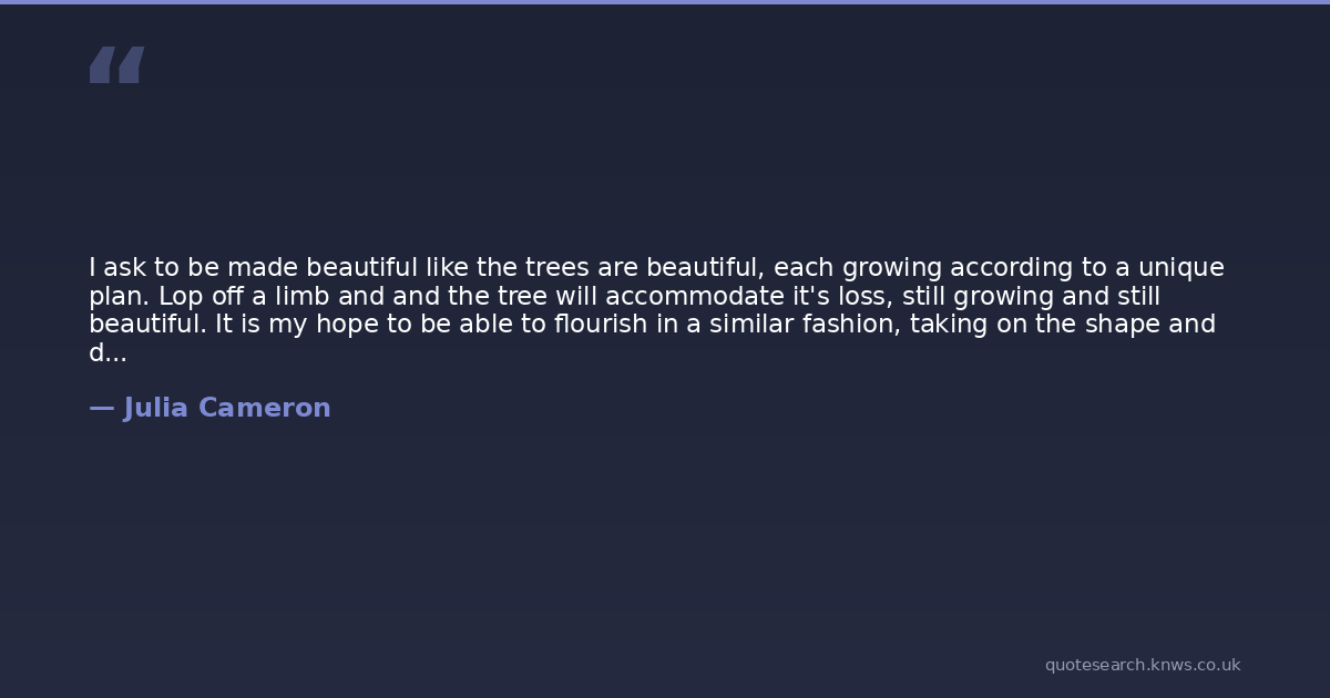 I ask to be made beautiful like the trees are beautiful, each growing according to a unique plan. Lop off a limb and and the tree will accommodate it's loss, still growing and still beautiful. It is my hope to be able to flourish in a similar fashion, taking on the shape and dimensions that is intended for me.