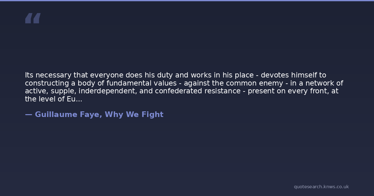 Its necessary that everyone does his duty and works in his place - devotes himself to constructing a body of fundamental values - against the common enemy - in a network of active, supple, inderdependent, and confederated resistance - present on every front, at the level of Europe - with the aim of concentrating all the energies of the combatants.