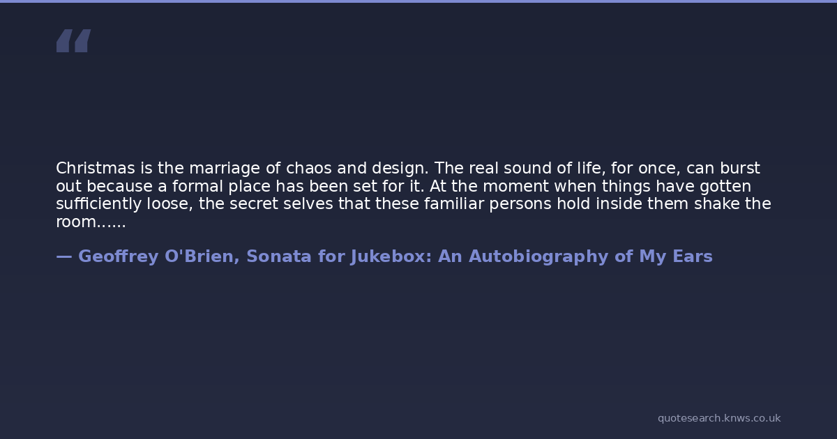 Christmas is the marriage of chaos and design. The real sound of life, for once, can burst out because a formal place has been set for it. At the moment when things have gotten sufficiently loose, the secret selves that these familiar persons hold inside them shake the room...An undercurrent of clowning and jostling is part of the process by which we succeed finally in making our necessary noise: despite the difficulty of getting the words right, of getting the singers on the same page, of keeping the ritual from falling apart into the anarchy of separate impulses. From such clatter--extended and punctuated by whatever instrument is handy, a triangle a tambourine, a Chinese gone--beauty is born.