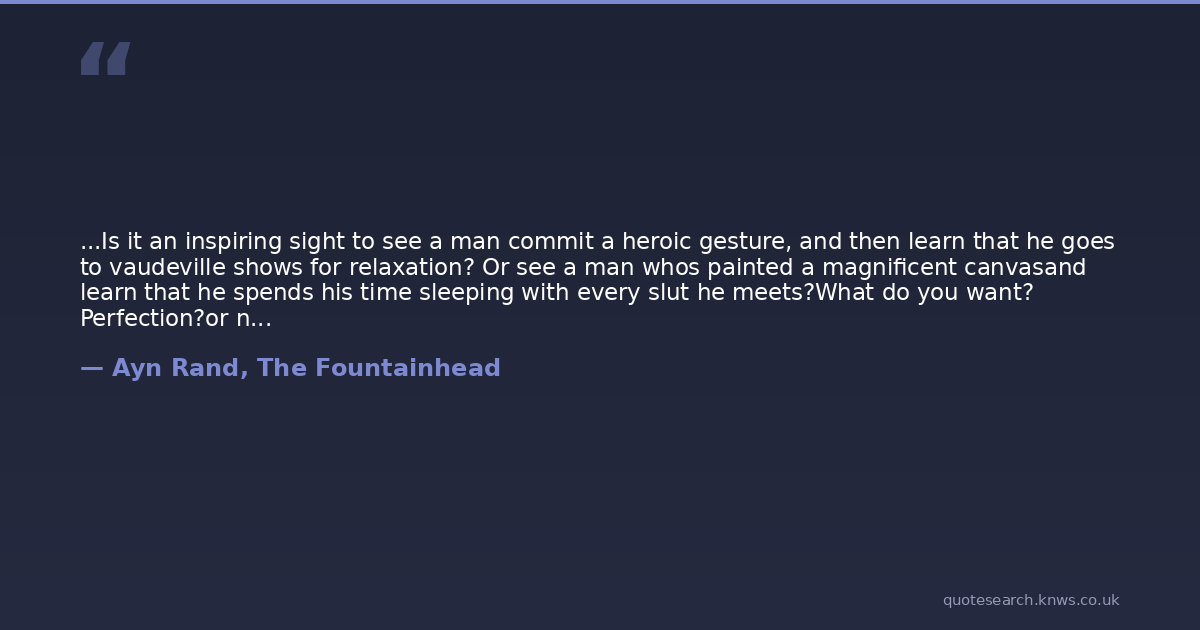 ...Is it an inspiring sight to see a man commit a heroic gesture, and then learn that he goes to vaudeville shows for relaxation? Or see a man whos painted a magnificent canvasand learn that he spends his time sleeping with every slut he meets?What do you want? Perfection?or nothing. So, you see, I take the nothing.