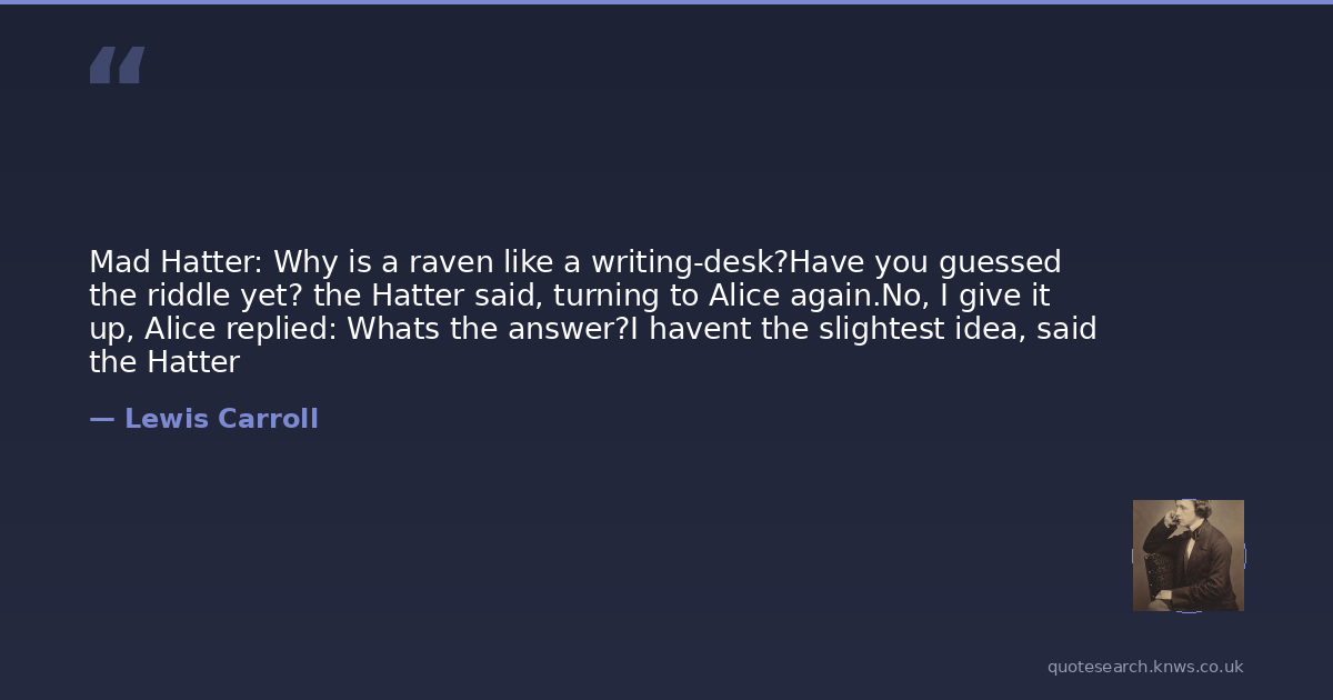 Mad Hatter: Why is a raven like a writing-desk?Have you guessed the riddle yet? the Hatter said, turning to Alice again.No, I give it up, Alice replied: Whats the answer?I havent the slightest idea, said the Hatter