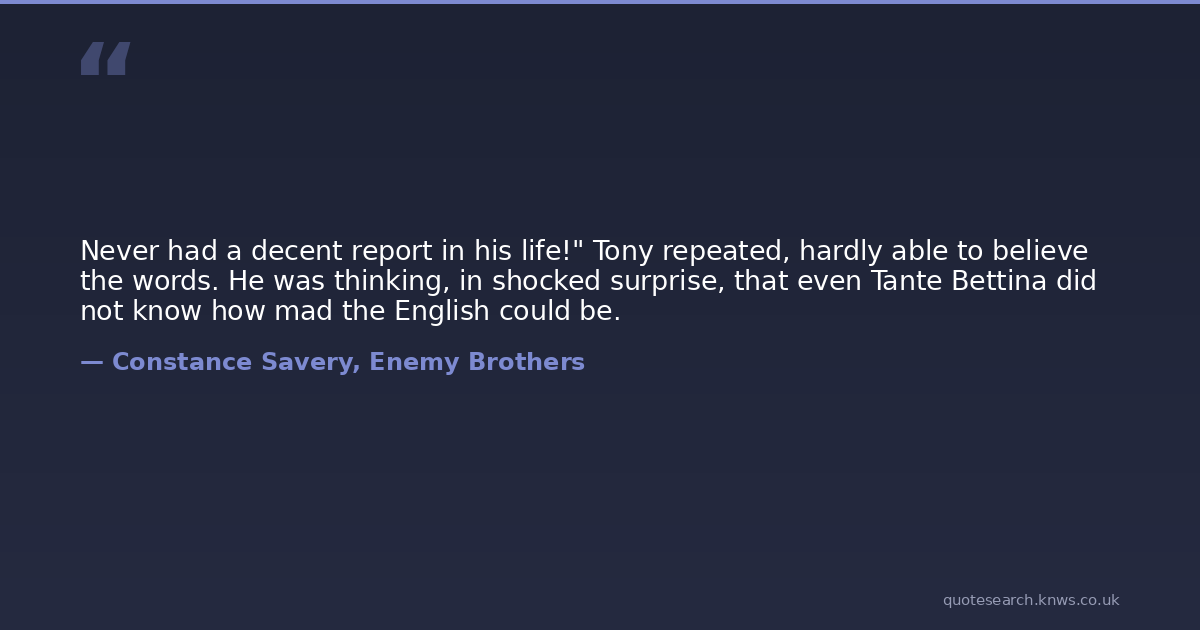 Never had a decent report in his life!" Tony repeated, hardly able to believe the words. He was thinking, in shocked surprise, that even Tante Bettina did not know how mad the English could be.