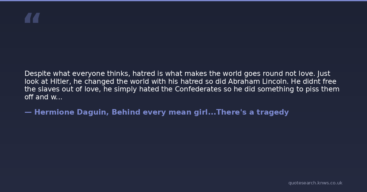 Despite what everyone thinks, hatred is what makes the world goes round not love. Just look at Hitler, he changed the world with his hatred so did Abraham Lincoln. He didnt free the slaves out of love, he simply hated the Confederates so he did something to piss them off and win the war.