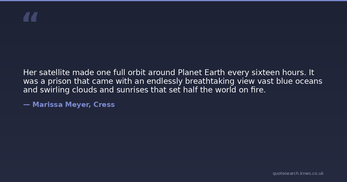 Her satellite made one full orbit around Planet Earth every sixteen hours. It was a prison that came with an endlessly breathtaking view vast blue oceans and swirling clouds and sunrises that set half the world on fire.