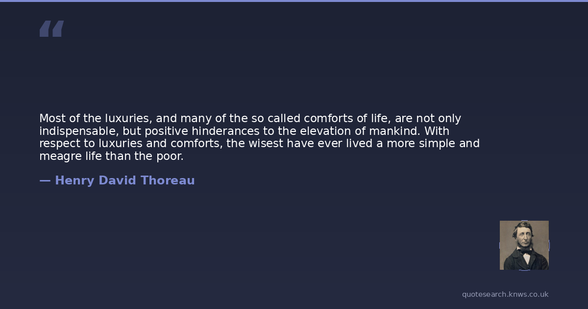 Most of the luxuries, and many of the so called comforts of life, are not only indispensable, but positive hinderances to the elevation of mankind. With respect to luxuries and comforts, the wisest have ever lived a more simple and meagre life than the poor.