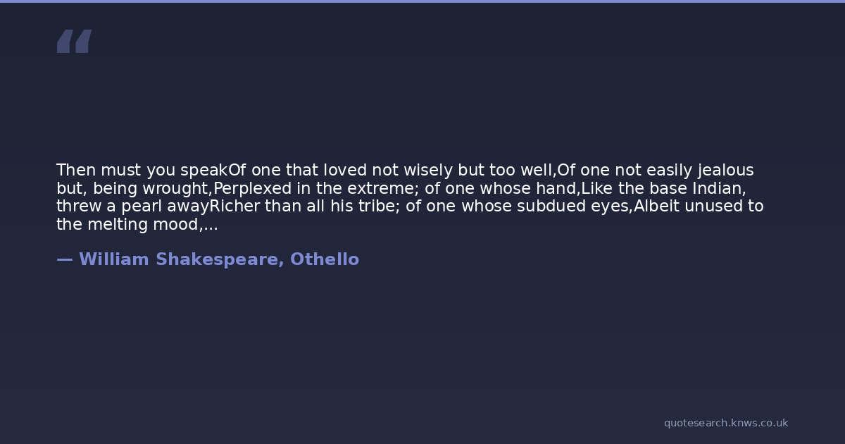 Then must you speakOf one that loved not wisely but too well,Of one not easily jealous but, being wrought,Perplexed in the extreme; of one whose hand,Like the base Indian, threw a pearl awayRicher than all his tribe; of one whose subdued eyes,Albeit unused to the melting mood,Drop tears as fast as the Arabian treesTheir medicinable gum. Set you down this,And say besides that in Aleppo once,Where a malignant and a turbaned TurkBeat a Venetian and traduced the state,I took by th' throat the circumcised dogAnd smote him thus.