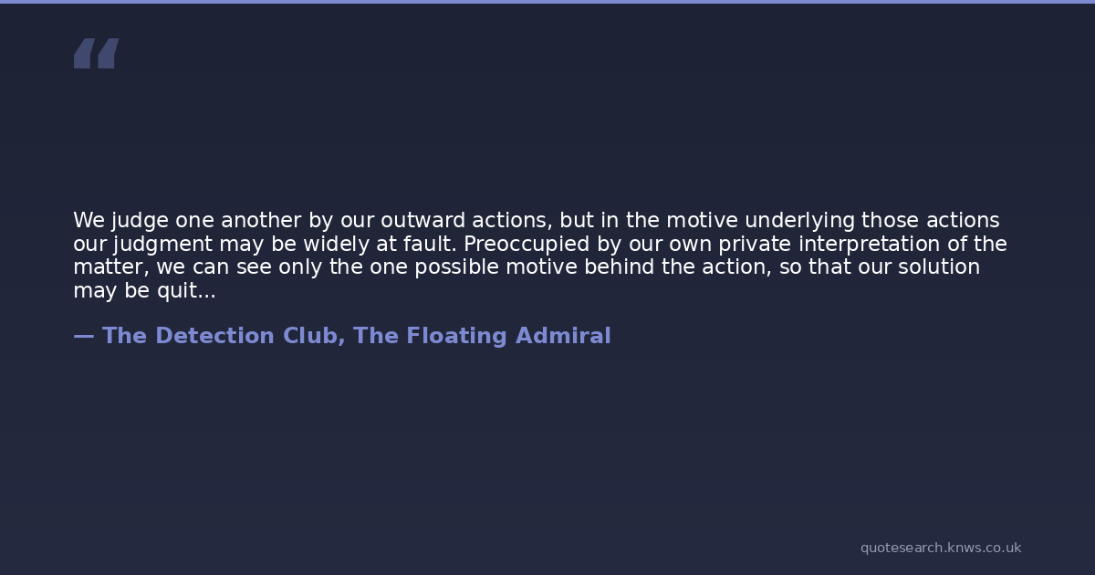 We judge one another by our outward actions, but in the motive underlying those actions our judgment may be widely at fault. Preoccupied by our own private interpretation of the matter, we can see only the one possible motive behind the action, so that our solution may be quite plausible, quite coherent, and quite wrong. - Dorothy L. Sayers, Introduction, Pg. 4