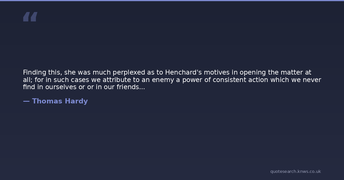 Finding this, she was much perplexed as to Henchard's motives in opening the matter at all; for in such cases we attribute to an enemy a power of consistent action which we never find in ourselves or or in our friends...