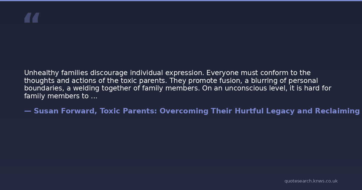 Unhealthy families discourage individual expression. Everyone must conform to the thoughts and actions of the toxic parents. They promote fusion, a blurring of personal boundaries, a welding together of family members. On an unconscious level, it is hard for family members to know where one ends and another begins. In their efforts to be close, they often suffocate one anothers individuality.